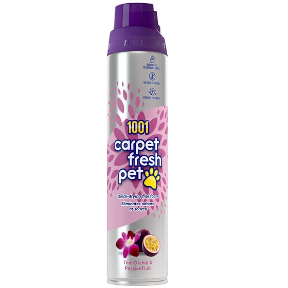 The 1001 Carpet Fresh Pet Thai Orchid & Passionfruit odour remover is a must have product for keeping your carpets smelling fresh and always looking great.