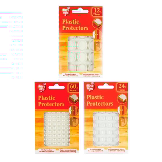 With three assorted sizes to fit doors and drawers of all shapes and sizes, the 151 Assorted Plastic Protectors are sticky-backed for easy placement and positioning.