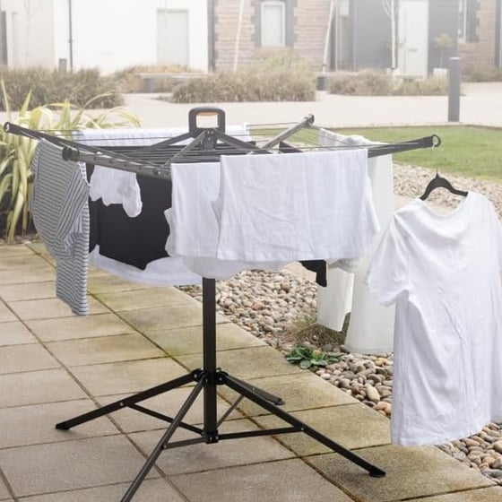 Each foot features spike holes for added ground stability, and the central hub lifts easily into place with a smooth rotary opening mechanism. When not in use, it folds down flat for simple storage. Whether you're sun-drying in summer or catching a breeze in cooler months, this portable line is ideal for renters, families or anyone short on fixed outdoor drying space.