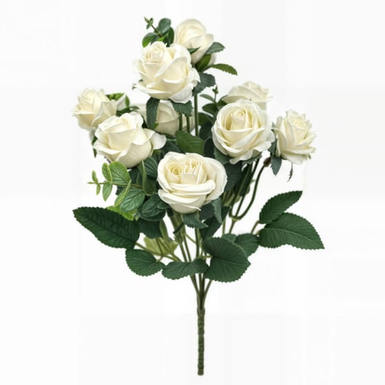 Artificial 10 Head Mini Rose Bush With Eucalyptus Ivory 32cm