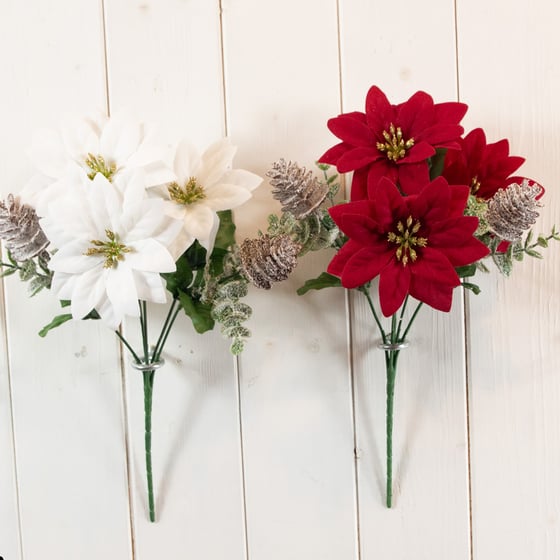 Bring Natural-Looking Festive Charm To Your Arrangements With The Artificial Christmas Poinsettia, Pinecone & Eucalyptus Bush – 5 Stems From Yorkshire Trading.