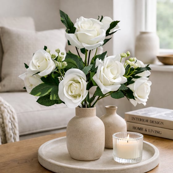 At 31cm tall, this artificial rose bush is ideal for styling in small to medium vases, centrepieces or decorative arrangements. Unlike real flowers, it requires no water, trimming or replacement, staying perfectly shaped and fresh looking throughout the year. Whether you are searching for artificial ivory roses for home décor in the UK, a faux rose bush for wedding styling, or realistic artificial flowers for a low maintenance display, this piece delivers reliable elegance without the ongoing cost of fresh blooms. Simply arrange, place and enjoy lasting floral charm in any room.