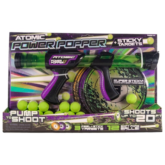 Experience the ultimate fun with the Atomic Power popper gun! This powerful gun comes with 12 foam balls, providing endless hours of entertainment.
