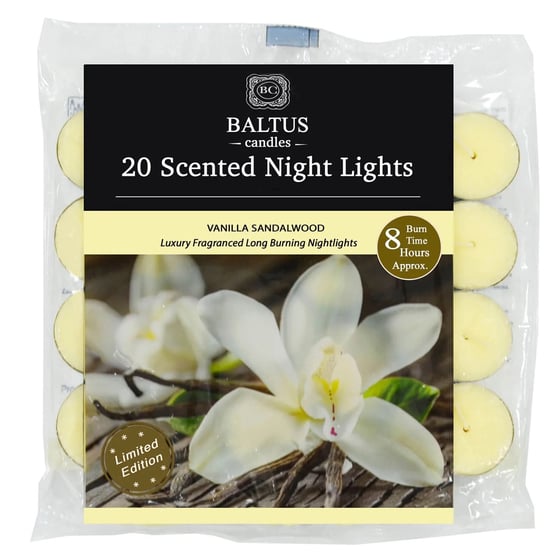 Light and warm up your home with the beautiful ambience of these vanilla sandalwood tea lights from Baltus. The sweet scent of vanilla and warm sandalwood burns evenly to lift the room and compliment its surroundings. Perfect for any room, the subtle aesthetic of the candle's design will fit into any environment and immediately make a house a home thanks to its modern aesthetics. You will really feel like you are relaxing in a beautiful garden, sliding into pure bliss with a refreshing drink. A burn time of up to 8 hours per candle will leave you confident in the knowledge that you'll be cosy for hours to come, with the scent lasting beautifully throughout the whole time. Capable of retaining its fragrance burn after burn, treat yourself to a wonderful evening surrounded by the scents of paradise.