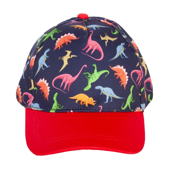 Designed to stand out for all the right reasons, the Bartleby Kids Multicoloured Dinosaur Baseball Cap pairs everyday sun protection with a bold dinosaur print kids love. This 100% cotton dinosaur print cap features a navy base covered in colourful favourites including t-rex, stegosaurus and pterosaurs, with a bright red peak and top button for a playful contrast that also improves visibility in crowded spaces. The adjustable snapback fastening offers a secure fit, making it a practical, wear-again choice for days out, holidays, and school trips.
