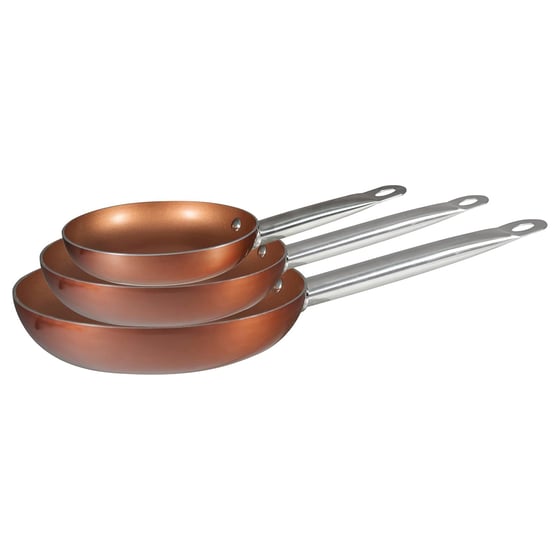 Efficiently cook your favourite dishes with the Bergner Set of 3 Copper Aluminium Frying Pans. Crafted with durable materials, these pans evenly distribute heat for thorough cooking. Their copper coating adds a touch of elegance while preventing food from sticking.