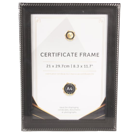 Display your achievements with pride using this sleek Black A4 Certificate Frame. Perfect for showcasing important documents, diplomas, certificates, or cherished photographs, this professional document holder adds a touch of sophistication to any wall display. The classic black frame design complements any décor, making it suitable for both office and home settings. The frame's clean lines and contemporary styling ensure your important papers are presented in an elegant manner whilst being protected. Whether you're creating a gallery wall of achievements or need a single frame for that special recognition, this A4-sized frame offers a polished way to preserve and exhibit your valuable documents. Easy to mount and featuring a protective front panel, this frame helps keep your certificates pristine while making them a focal point of any room.