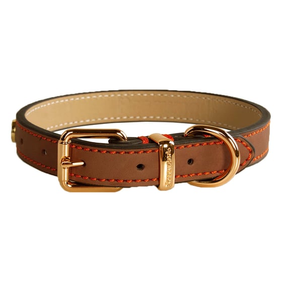 Make your dog the most stylish in the park with this luxury leather dog collar. Made from fine leather and suedette material, the rich brown is interspersed with vibrant orange stitching and a decorative paw emblem.