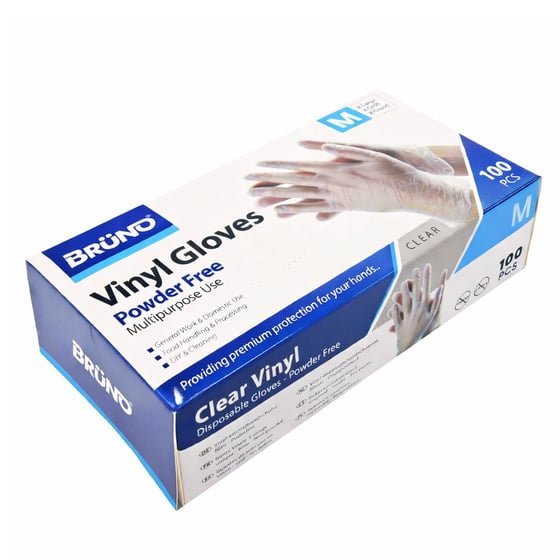 Protect Your Hands With Bruno Clear Medium Vinyl Gloves 100 Pack For Hygienic Multipurpose Use At Home Or Work.