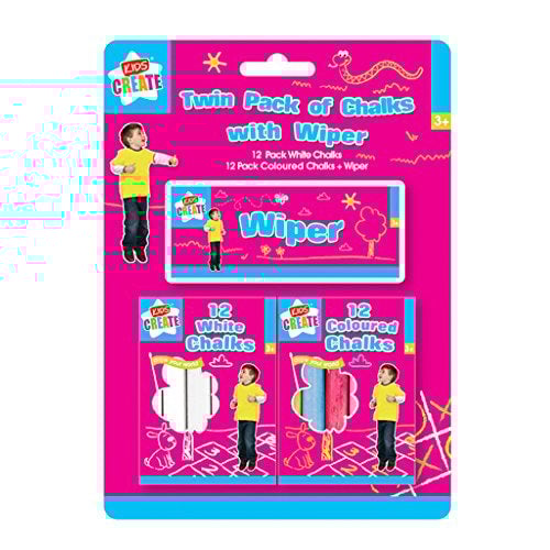 A great gift for crafty kids, this twin pack chalk and duster set contains one pack of 12 white chalk sticks, one pack of 12 colourful chalk sticks and one dry chalk duster.