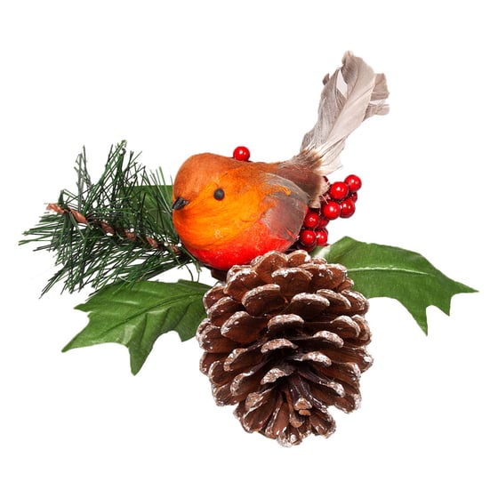 Add some elegance to your home decorations with this beautiful Christmas robin pick. Carefully designed to be able to fit perfectly into any home, it is sure to be a talking point for all of your guests. Display on its own, attach to your Christmas tree, or add to a display with other florals. You will be able to express your creativity and eye for design with the addition of this pick. The natural look of the berries and leaves alongside the pinecone make it look as if it has all been collected on a winter's walk through a forest. Really get into the festive mood with the addition of this stunning pick to your home. Christmas doesn't always have to be about bright colours, sometimes the best decorations are those that have an elegant beauty.