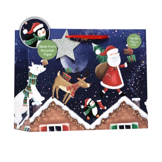 Give your loved ones their Christmas presents in a beautifully illustrated gift bag. Gift giving can often be the most heartwarming part of the Christmas season, so show them just how much you care by presenting them with this gift bag holding all of their gifts. Made from recycled paper, you won't need to worry about using plastic bags which are bad for the environment. Instead, you can be happy in the knowledge that not only care has gone into the presents themselves, but also that care has been put into the making of this gift bag. An accompanying glitter star gift tag delightfully compliments the design of the gift bag, so that you can write a heartfelt little note to go alongside the presents within.