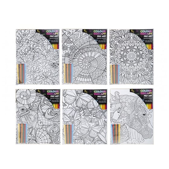 Unleash your creativity with the Colour Therapy felt art kit! This 11" x 15" set includes felt sheets and pens, perfect for colouring in various patterns and relieving stress.