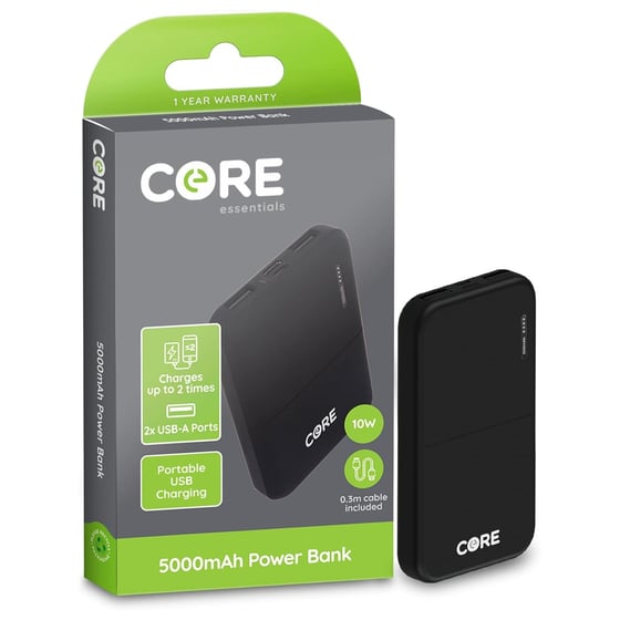 Stay charged on the go with the Core Essentials Black 5000mah Power Bank.