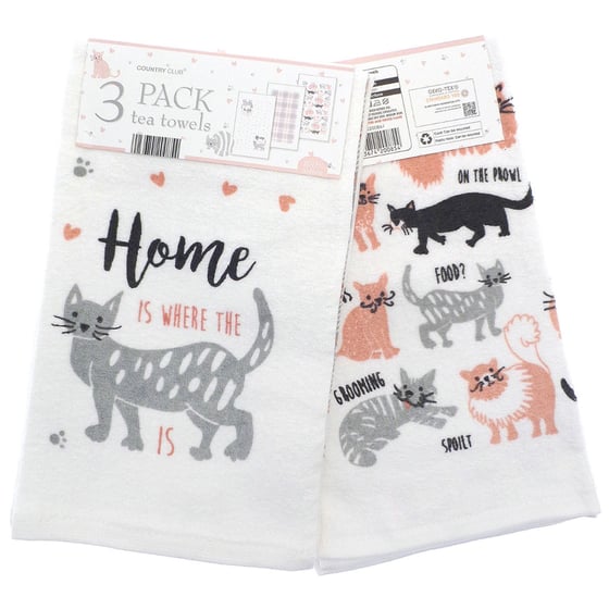 Add a touch of style to your kitchen with this pack of 3 cotton tea towels. Whereas standard tea towels can be plain and noticeably 'simple', each of these towels has a beautifully designed illustration perfect to fit right into your kitchen decor. Inspired by the cutest cats and masterfully drawn by artists, the complementary colours are brilliant for brightening up any home.