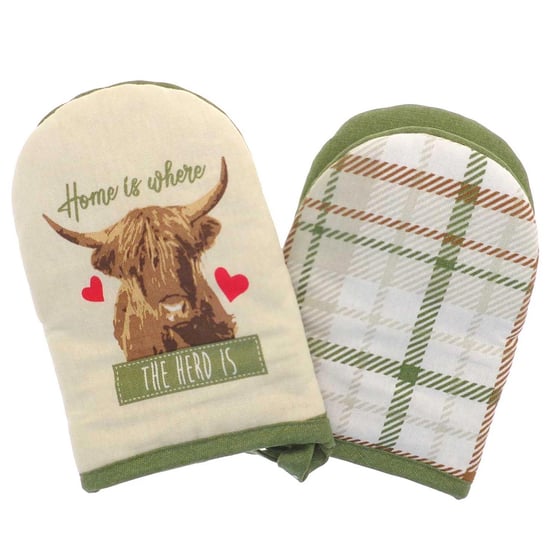 Featuring a charming Highland cow design with coordinating tartan style detailing, these mini oven mitts bring rustic character to farmhouse and country inspired kitchens. The padded construction helps provide heat resistance for everyday tasks, while the smaller size allows for better flexibility and control when gripping cookware. Ideal if you are looking for heat resistant mini oven gloves, country style pot holders, or a thoughtful kitchen gift, this two pack ensures you always have a mitt to hand when you need it most.