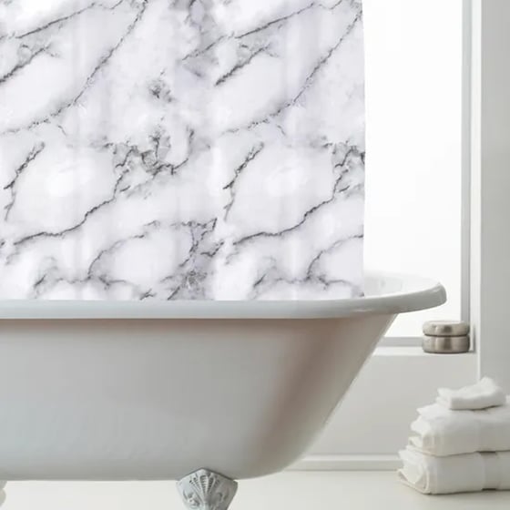 Transform your bathroom into a luxurious sanctuary with this sophisticated marble-patterned shower curtain. Measuring a generous 180 x 180 centimetres, this curtain provides excellent coverage for standard-sized shower enclosures and bathtubs. The elegant marble design adds a touch of modern sophistication to your bathroom décor, creating a spa-like atmosphere in your daily routine. The curtain's ample dimensions ensure proper water containment while showering, protecting your bathroom floors from splashes and spills. Perfect for contemporary bathroom settings, this shower curtain combines practicality with style. The versatile grey and white marble pattern effortlessly complements various bathroom colour schemes and fixtures. Make this stunning shower curtain the centrepiece of your bathroom's design scheme and enjoy its blend of functionality and contemporary aesthetics.
