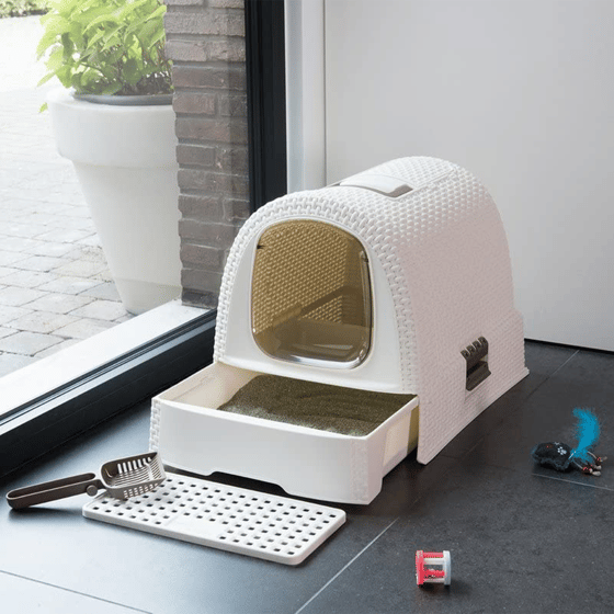 The front has a swing door that your cat can easily push open to get inside. You will also find a handle on top for moving the tray around as well for cleaning. The tray in the bottom slides along the rails inside and clips into place using the handles on the side and there is a grate for the front of the tray so that the litter can drop off little paws as they comes out. You can also put this on the outside if preferred on a mat.
