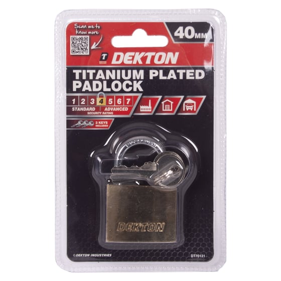 The Dekton titanium plated padlock includes 3 keys for locking and unlocking which can be used for securing gates and hasps.