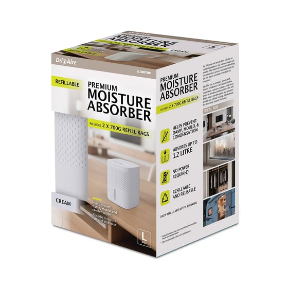 What makes this dehumidifier different? It's refillable, reusable, and smartly designed with both form and function in mind. Each unit comes with two 700g refill bags—lasting up to 3 months each—so you get lasting value straight out of the box. With a sleek, minimalist shape and a soft cream finish, it blends right into any living space. Plus, setup is as simple as opening the lid and placing the refill—no tech skills, no plug sockets, just straightforward protection from the everyday headache of humidity. Whether you're dealing with draughty corners or want to protect stored clothes and documents, Dri Aire has you covered.
