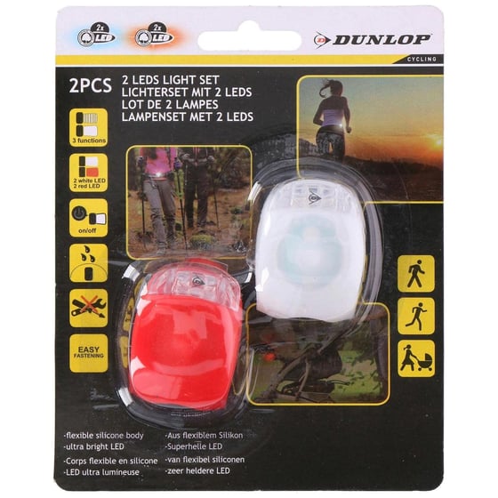Stand out and stay visible in the dark with the Dunlop light set which can be attached to your clothing, strollers or a bicycle with a handy clip.