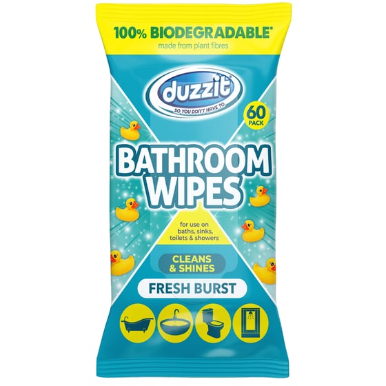 Keep your bathroom spotless in seconds with Duzzit Biodegradable Fresh Burst Bathroom Wipes 60 Pack—fast, eco-friendly, and fuss-free.