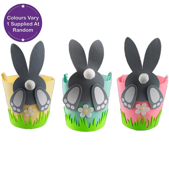 Each basket is designed with a solid pastel colour bag and a bunny jumping into the grass. Constructed from Felt and a fluffy pompom. This bag will make anyone smile. This is perfect for collecting your eggs, storing your eggs or for the hardcore easter shoppers!