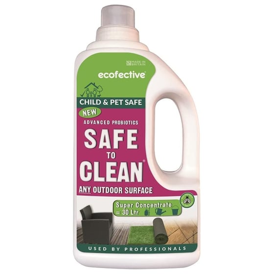 The Ecofective safe to clean is a unique multi-purpose probiotic cleaner that is suitable for cleaning any outdoor surfaces including artificial turf, wood, concrete, stone, glass, and fabrics.