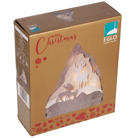 Create a warm and festive atmosphere this season with the EGLO LED Reindeer Standing Decoration 21cm. Featuring a charming woodland scene with reindeer and trees, this decorative light adds a cosy glow to any mantelpiece, windowsill, or festive display.