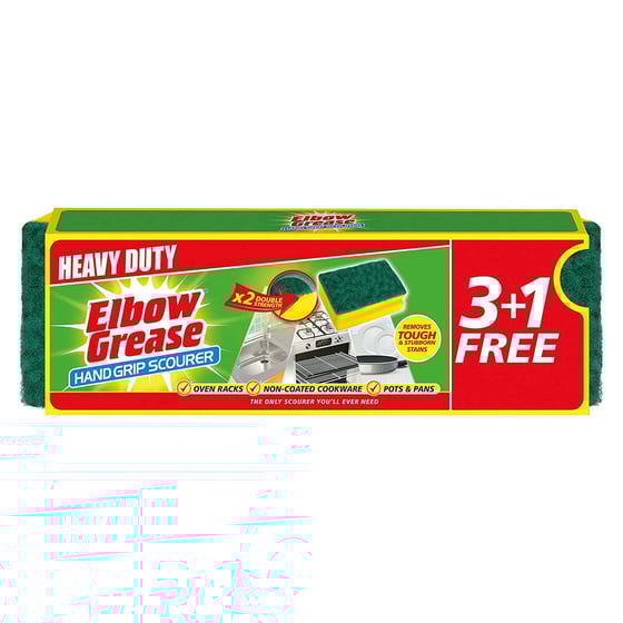 Keep your non-coated cookware, oven racks, and pots and pans grease and grime free with this fantastic 4 pack of hand grip scourers from Elbow Grease which features double-strength materials for heavy-duty cleaning.
