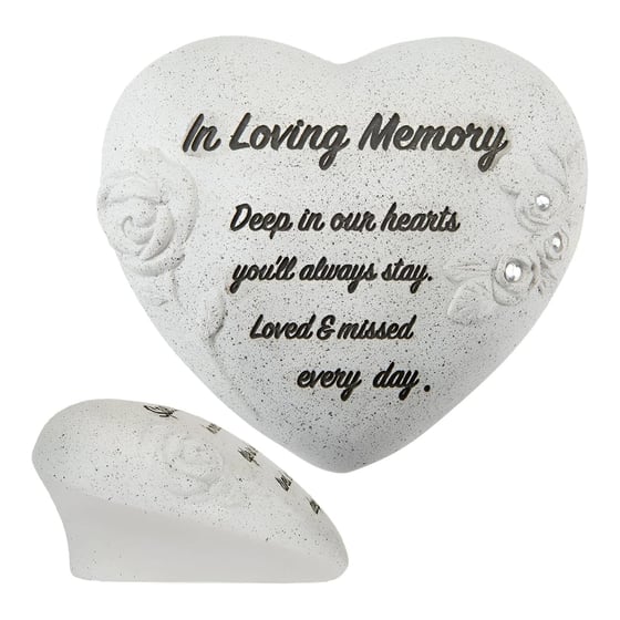 The Eternal Polyresin In Loving Memory Grey Diamante Heart Memorial offers a thoughtful way to honour someone special. Shaped as a heart and inscribed with the touching words “In Loving Memory Deep in our hearts you’ll always stay. Loved & missed every day.”, this memorial ornament provides a lasting expression of love and remembrance. The soft grey speckled finish gives it a natural stone effect, while subtle diamante detailing adds a gentle decorative accent.