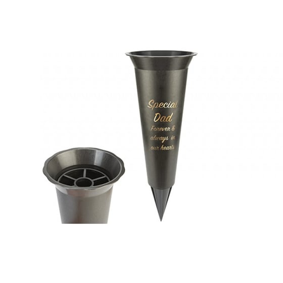 Designed for outdoor cemetery use, this black memorial flower vase includes a pointed ground spike that secures firmly into soil for improved stability. This helps reduce movement in wind and unsettled weather, keeping your tribute in place between visits. The understated black finish paired with gold lettering ensures a respectful appearance that blends naturally within graveside surroundings. Whether you are marking Father’s Day, an anniversary, or simply maintaining a family grave, this grave flower vase with spike combines practical durability with heartfelt sentiment.