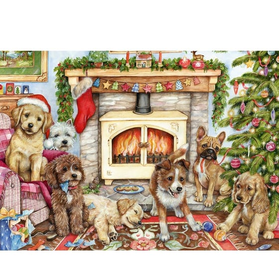 Christmas Puppies is the fantastically festive-themed 500 pieced jigsaw puzzle from Falcon. The Christmas-filled puzzle has a combination of people's favorites including Christmas and puppies, what's not to love? The festive display showcases a stunning Christmas tree, decorations above the wood-burning stove, stockings, and the puppies are even in the festive spirit as one of those is wearing a Santa hat.