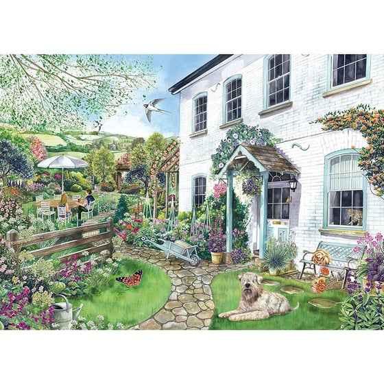 Cottage With A View is the title of this wonderful jigsaw from Falcon, part of the Scenery puzzle theme. The 1000 piece jigsaw depicts a colourful scene with a picturesque country cottage in the background and its lush gardens in full bloom. The owners of the cottage are enjoying a quiet drink at the picnic table a the resident cat and dog relax on the lawn.