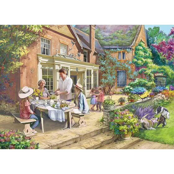 This fabulous picturesque puzzle from Falcon showcases a family tea time on the terrace of a stately country home where the sun is shining with flowers in bloom and dogs playing merrily on the lawn.