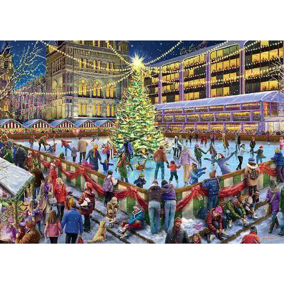The Ice Rink is the title of this fantastic jigsaw from Falcon and is part of the wonderful Falcon scenery puzzle theme. This jigsaw transports puzzlers to a busy town centre around Christmas time as friends and families are gathered around to enjoy the festive ice rink, as they glide around the beautifully decorated tree.