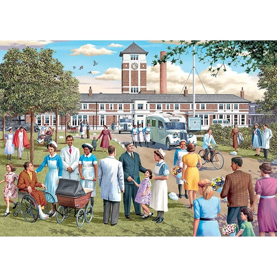 The National Health Service from Falcon is the title of this fantastic 1000 pieced jigsaw and is part of the excellent Nostalgia collection. History was made when the NHS was founded on the 5th of July 1948 when healthcare became accessible to all. This jigsaw showcases the park hospital in greater Manchester which was the very first NHS hospital and features the Minister of Health and founder of the NHS, Aneurin Bevan.