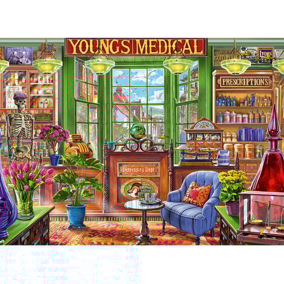The Pharmacy Shop from Falcon is the title of this 1000 piece from Falcon and an exquisitely illustrated jigsaw is part of the Falcon nostalgia collection. The wonderful image showcases a traditional village pharmacy and is guaranteed to take you back in time to a by-gone era. The pharmacy features colourful bottles and jars filled with remedies and pick-me-ups ready to be measured out while customers take a comfortable seat.