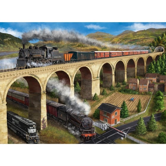 The Viaduct is the title of this wonderful illustration from Falcon and the 1000 piece jigsaw captures a beautiful day in the countryside filled with some magnificent steam trains going past.