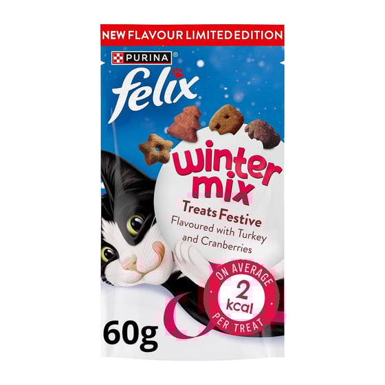 Felix Winter Mix Cat Treats Bring Turkey, Cranberry, Stars And Trees Together—The Fun, Festive Way To Spoil Your Cat At Christmas.