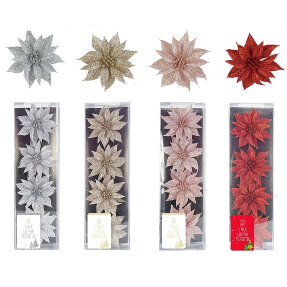 Add a touch of festive magic to your décor with this pack of four glitter-dusted 9cm poinsettias.
