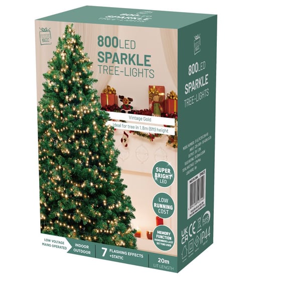 The Christmas lights feature a gold hue and space saving design which create a wonderful twinkling Christmas charm which we all crave. With a generous 20m lit length and 2.5cm bulb spacing, decorating large spaces has never been easier. The tree lights feature 7 flashing effects with a static mode and there's a memory function which remembers the last setting used.