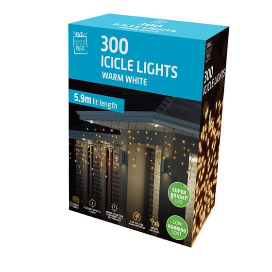Create a magical Christmas atmosphere with Festive Magic warm white icicle Christmas lights. These 300 LED lights will add a warm and inviting glow to your home, making it the perfect setting for festive gatherings and cosy nights in. Transform your space into a winter wonderland with these beautiful and energy-efficient lights.