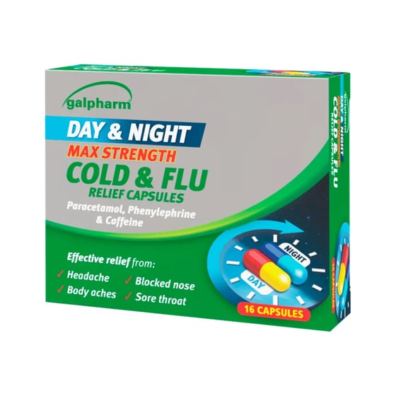 Fight Off Cold And Flu Symptoms Fast With Galpharm Day & Night Max Strength Cold & Flu Relief Capsules For 24-Hour Symptom Control.
