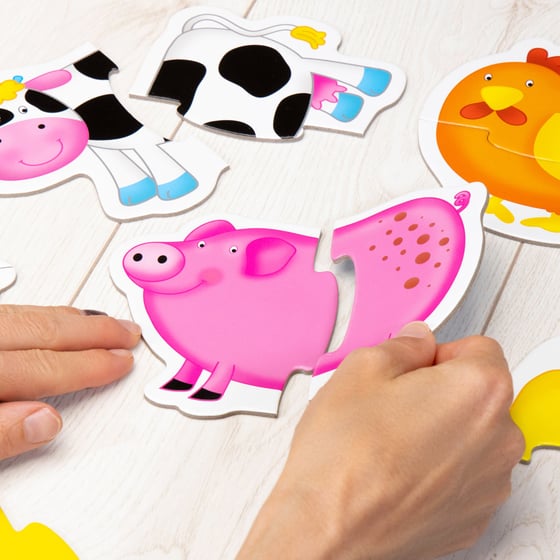 Introduce your little one to the wonderful world of jigsaws with this bright and colourful 6 shaped 2-piece farm puzzle set from Galt Toys which allow your little one to learn all about farm animals while also having fun piecing the jigsaws together.