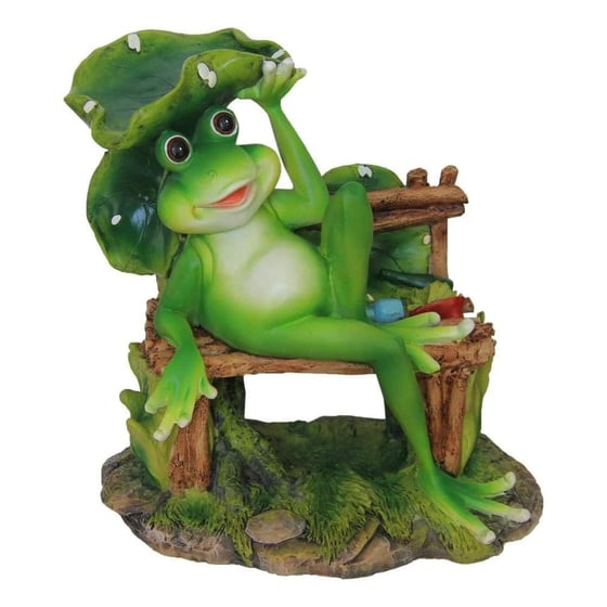Add a whimsical touch to your garden with this fantastic cute frog that is sitting on a bench underneath a lily pad that will add some interest to any flower bed, fairy garden, backyard, or front porch.