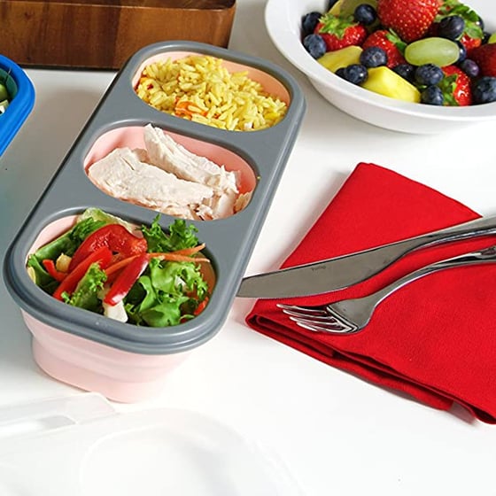 The 3 compartments allow you to separate your food and can be ideally portioned up into sections and can be filled with different food groups including meat, veg, rice, fruit, etc. When the expandable food box is not in use, the container collapses to less than a third of its size for quick, easy space-saving storage.