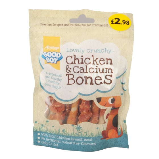 The Good Boy crunchy chicken and calcium bones are a complementary pet food for dogs and are made with super duper tasty 100% natural chicken breast meat so are sure to become one of your dogs favourite treats.
