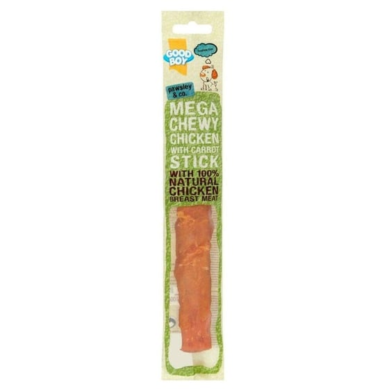 - Mega chewy chicken with carrot stick: with 100% natural chicken breast meat, no artificial colours, flavours or preservatives, rawhide-free.