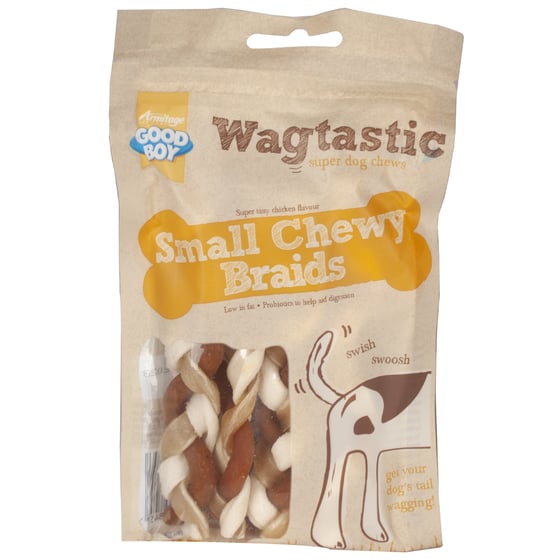 The wagtastic small chewy braids from Good Boy is guaranteed to make your dogs tail waggle as these really exciting yummy chews will keep your dog happy as well as entertained.